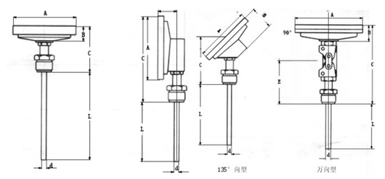 3、135°向型双金属温度计:指针盘与保护管成135°连接;