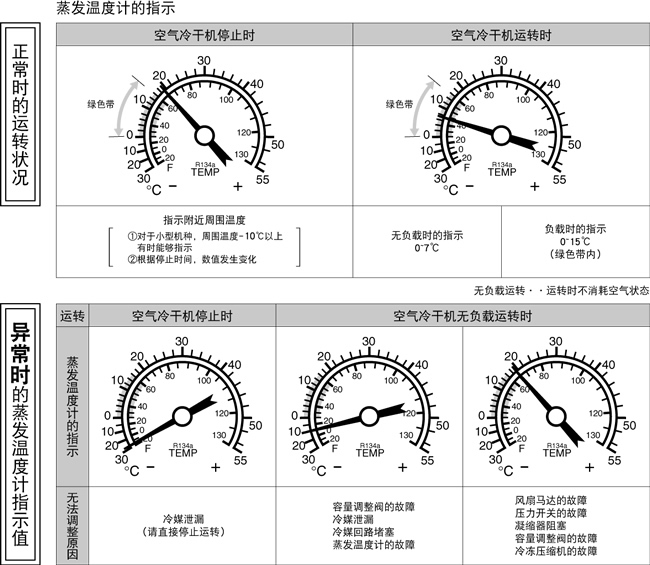 请确认冷干燥机运行时蒸发温度计的指示在绿色范围内。