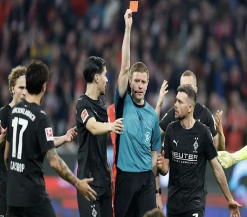 北京时间3月7日,德甲第25轮,拜仁慕尼黑4-1门兴格拉德巴赫。比赛第55分钟,主裁判罗伯特-施罗德在门兴球员赖茨与...