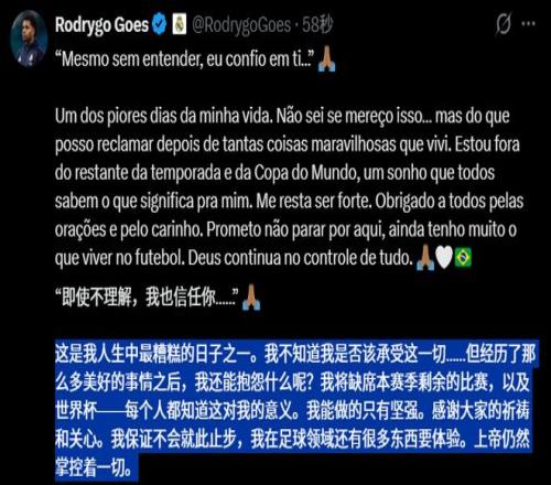 皇马确认罗德里戈遭遇右膝前十字韧带断裂外加外侧半月板断裂的重伤,球员本人在社媒发声,表态自己缺席世界杯,但自己不会就此止步。