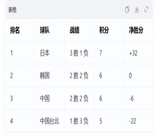 第一名是3胜1负积7分,净胜分+32的日本队;第二名为2胜2负积6分,净胜分为0分的韩国队;第三名为2胜2负积6分,净胜分为-6分的中国队;第四名为1胜3负积5分,净胜分为-22的中国台北队。