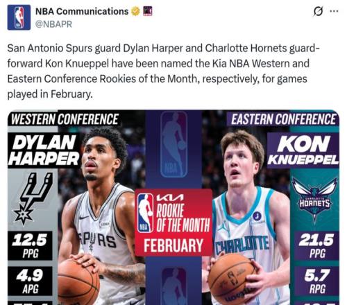 值得一提的是,在本场比赛开始前,克努佩尔才当选2月份月最佳新秀,2月份他场均可以拿下21.5分5.7板,三分命中率48.5%。