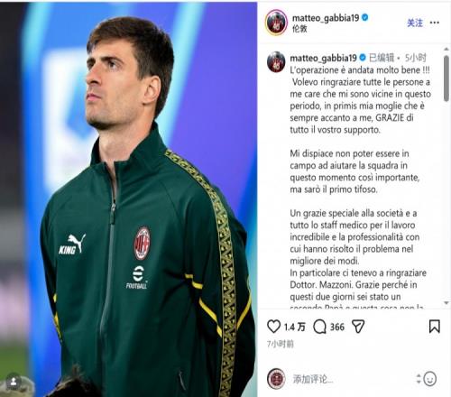 米兰后卫加比亚在社交媒体上更新了动态,宣布他已成功接受腹股沟疝手术。他在帖子中表示:“手术进行得非常顺利!我想感谢所有在这段时间陪伴并关心我的人,特别是我的妻子,她一直在我身边支持我。感谢大家的鼓励与关心!