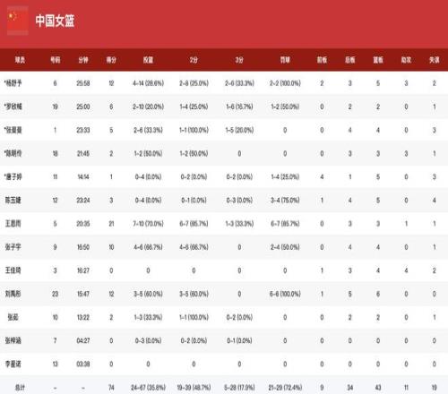 此役,中国女篮全队三分28投5中,命中率仅为17.9%,此外还出现了19次失误。