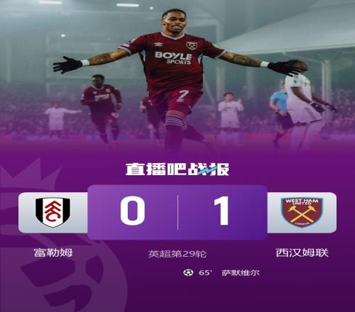下半场伤停补时6分钟,全场比赛结束,最终西汉姆联1-0富勒姆。