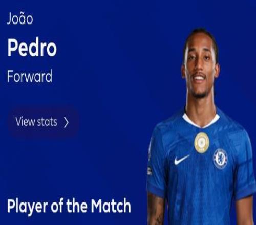 三球一助,若昂佩德罗当选切尔西客战维拉全场最佳球员