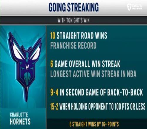 值得一提的是,这是黄蜂背靠背第二晚的比赛,至此,他们本赛季背靠背第二晚的战绩已经是9胜4负。与此同时,黄蜂连续第10场客场比赛取胜,创造了队史纪录。另外值得一提的是,过去6连胜期间,黄蜂全部赢对手至少15分,上一支能做到这一点的球队还是2017-18赛季的勇士。