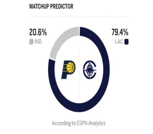 反观客场作战的步行者,本赛季以短暂重建为目标,本赛季战绩15胜46负,近期更是遭遇6连败,排名东部垫底。在106—125不敌魔术后,步行者以全败战绩结束四连主赛程。对阵魔术一役,贾雷斯?沃克砍下21分成为步行者队的唯一亮点,其他球员的表现则不尽如人意。本赛季明确摆烂的他们,正持续肆无忌惮地俯冲状元签。面对即战力缺乏与战意不足的步行者,正全力赶超勇士的快船,自然不会错过这个轻松取胜的机会。美媒ESPN预测本场比赛的胜率,快船取胜概率高达79.4%,步行者胜率低至20.6%。