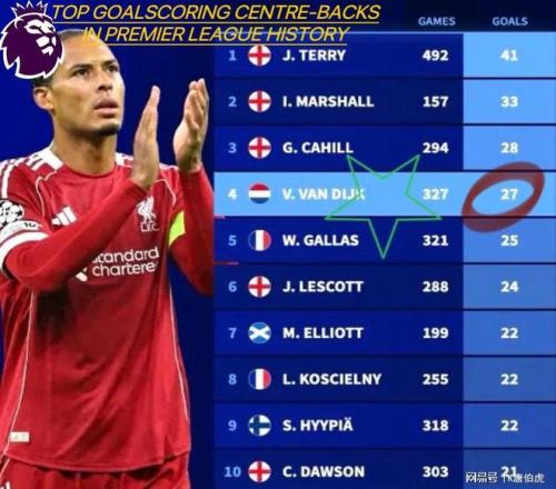 英超后卫进球榜:范戴克上升至历史第二(不包括点球)