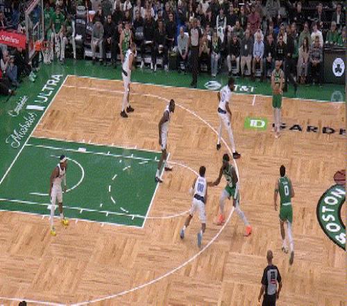 第一节的塔图姆其实挺低调的,起手三个球都是挡拆找凯塔,一次凯塔得手,一次没扣进,一次凯塔造成了杀伤。之后塔图姆又弧顶发牌,找到了借无球掩护切出的杰伦·布朗,三分命中!