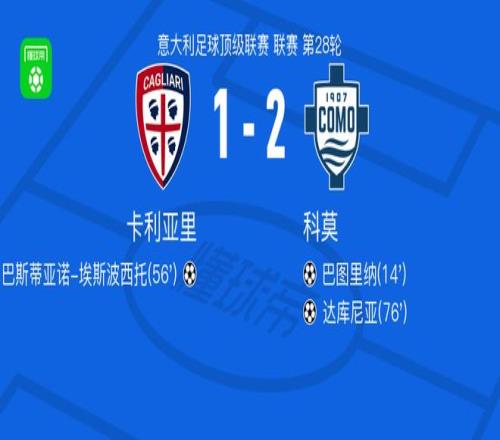 北京时间3月7日意大利足球甲级联赛第28轮,卡利亚里主场迎战科莫。比赛中,科莫率先取得进球,随后卡利亚里扳平比分,科莫再次进球锁定胜局。具体战报如下: 科莫球员巴图里纳打入一球,帮助球队取得领先;卡利亚里球员塞巴斯蒂亚诺-埃斯波西托破门,将比分扳平;科莫球员达库尼亚打入一球,为球队扩大优势。最终,卡利亚里1-2不敌科莫。