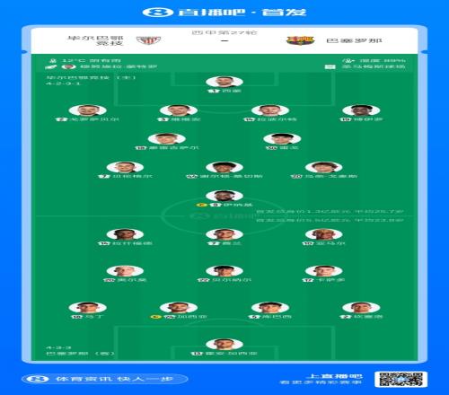 巴萨首发:13-霍安·加西亚、2-坎塞洛、5-库巴西、18-赫拉德·马丁、24-埃里克·加西亚、17-卡萨多、22-贝尔纳尔、20-奥尔莫、7-费兰、10-亚马尔、14-拉什福德