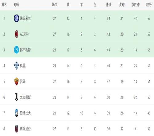 在积分榜上,国际米兰依然遥遥领先,以67分高居榜首,战绩是22胜1平4负。排名第2的是AC米兰,只拿到57分,足足落后10分。显然,意甲的冠军归属基本失去了悬念。卫冕冠军那不勒斯只拿到56分,排名第3??颇蛑螅芑执锏?1分,升到了第4名。而同样51分的罗马掉到第5名。尤文图斯50分,在争四集团中稍稍落后,排名第6。