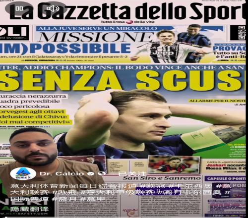 我后来去他的主页看了他发布的内容:照片主要是分享各类资讯;视频则是两类,其中一类是他出镜的视频,背景是《米兰体育报》的封面,我猜测他是对《米兰体育报》的相关封面报道进行延伸解读。另一类则是他现场拍摄的比赛片段。