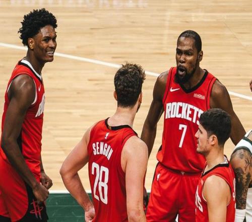 火箭队现在剑走偏锋,他们的目标就是利用全员防守战术去战胜对手,把对手的得分压低,同时自己用投抢战术得到更多的分数。所谓的投抢战术,就是火箭队一旦投不进,那么疯狂去抢前场篮板形成二次进攻,甚至是三次进攻机会。